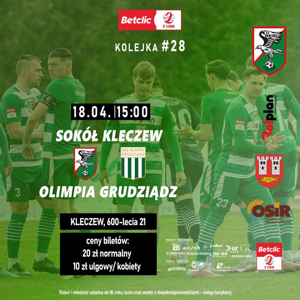 Dzisiaj o godz. 15.00 Sokół Kleczew rozegra mecz z wiceliderem Betclic 2. Ligi – Olimpią Grudziądz.