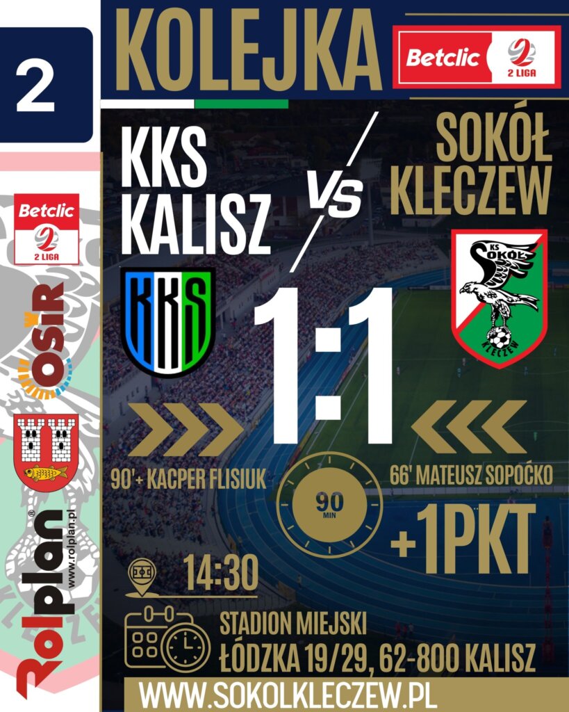 W derbowym starciu 2. kolejki Betclic 2. Ligi Sokół Kleczew zremisował na wyjeździe z KKS-em Kalisz 1:1. Choć przez większość spotkania kleczewianie dominowali i stworzyli sobie wiele znakomitych sytuacji, to ostatecznie muszą zadowolić się tylko jednym punktem. Gospodarze wyrównali dopiero w doliczonym czasie gry, wykorzystując chwilę nieuwagi w szeregach defensywnych Sokoła.